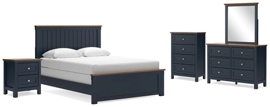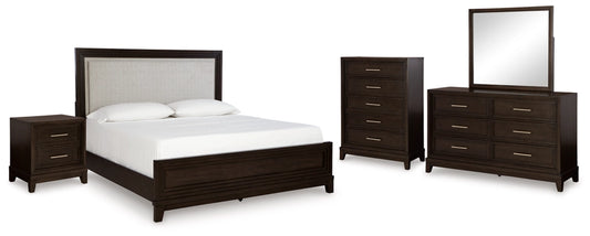 Neymorton Queen Upholstered Panel Bed with Mirrored Dresser, Chest and Nightstand
