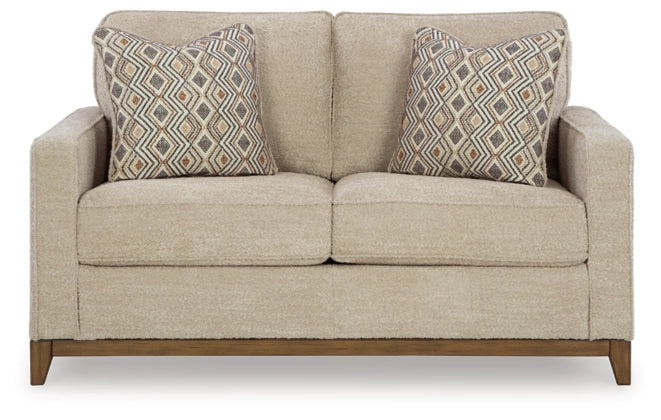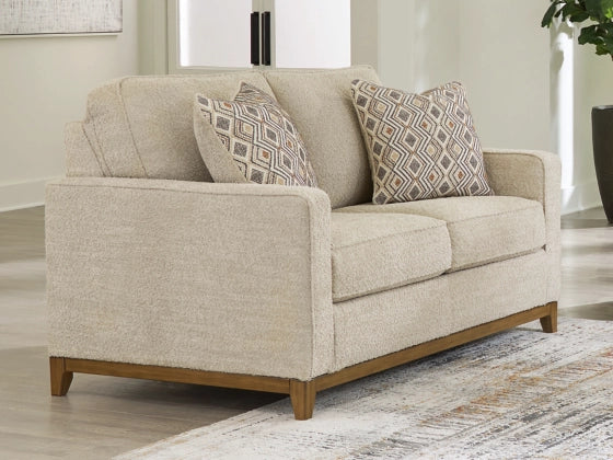 Serene style with a modern sensibility. Delight in the cozy, versatile embrace of this loveseat. It takes an on-trend approach to irresistible texture and natural beauty, showcasing soft upholstery accented with a transitional wood trim. As refined as it is laid back, the loveseat also keeps comfort a priority with plush, thick seat cushions.