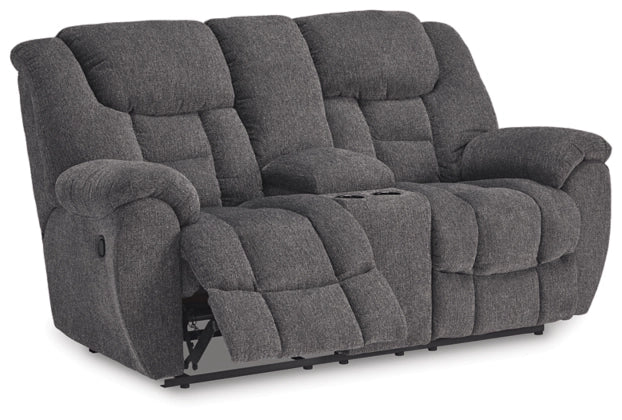 Sometimes seeing is believing. And you can rest assured that this reclining loveseat with console is every bit as indulgent as it looks. Designed to put you in the lap of luxury, the generously scaled seating—wrapped in a wonderfully plush and practical charcoal gray Next-Gen Nuvella™ upholstery—sports pillow-wrapped armrests and curvaceously cushioned head-neck support for feel-good flair.