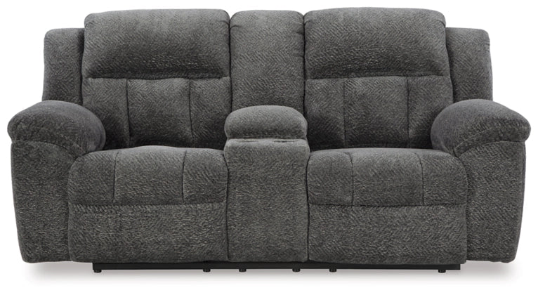 With its large-scale design, this extra-spacious reclining loveseat with console is a masterclass in accessible style. Plush, ultra-soft upholstery keeps everyone cozy as you lounge with family or guests. In a neutral hue, it seamlessly suits different aesthetics as your taste changes. Time to relax? The loveseat's pull tab reclining allows you to mellow out with ease.