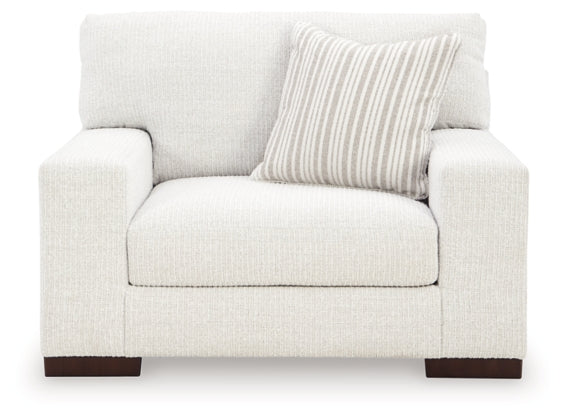 Easy on the eyes and irresistibly comfortable, this oversized chair blends beautifully into any setting. Contemporary wide track arms and plush cushions covered in soft, stain resistant Next-Gen Nuvellaβ’ upholstery lend this piece a sense of everyday ease. A simple striped accent pillow in complementary colors adds subtle contrast.