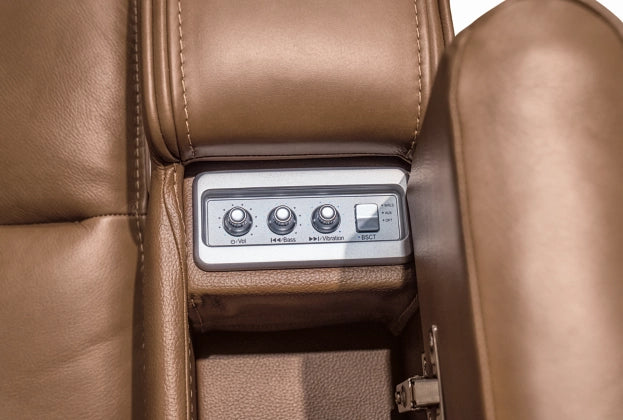 - Armrests with flip-top storage; hidden Thunder control panel with adjustable volume, bass and vibration knobs