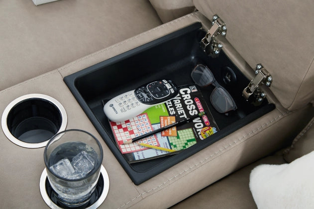 Indulge your lust for comfort and love for contemporary design with this reclining loveseat. Made for easy everyday living, it’s upholstered in a heavyweight padded faux leather and accented with contrast jumbo stitching for fashion-forward flair. Sleek track arms elevate the look with a touch of modern sensibility. A padded center console with dual cup holders completes the experience.