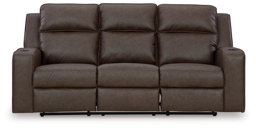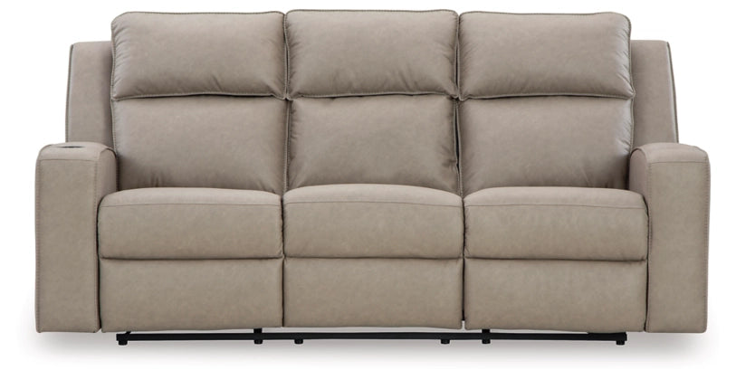 Indulge your lust for comfort and love for contemporary design with this reclining sofa. Made for easy everyday living, it’s upholstered in a heavyweight padded faux leather and accented with contrast jumbo stitching for fashion-forward flair. Sleek track arms elevate the look with a touch of modern sensibility. A drop-down table with dual cup holders and USB ports completes the experience.