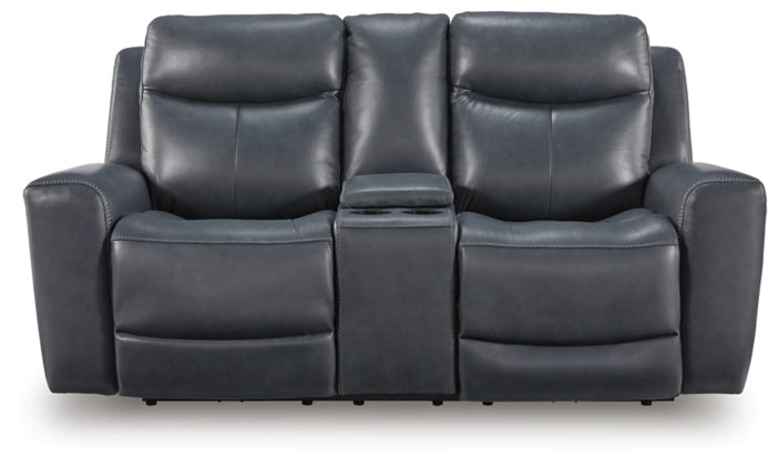 Prepare to be moved. This power reclining loveseat with console combines sleek modern design with all the soothing features you've been dreaming of. Wrapped in blue-hued leather and faux leather for affordable luxury, this highly contemporary piece with cozy scoop seating suits your relaxed vibe. Infinite reclining and headrest positions are yours at the touch of a button. It's the perfect choice for anyone who wants their comfort with a side of style.