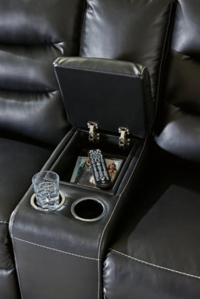 With its decidedly contemporary styling, this power reclining loveseat with console has a sleek sensibility that seamlessly elevates your living room aesthetic. Explore endless possibilities for comfort with its one-touch power control, zero-gravity reclining and adjustable headrests. A triple-tier back and chic black upholstery round out this simply stunning piece.